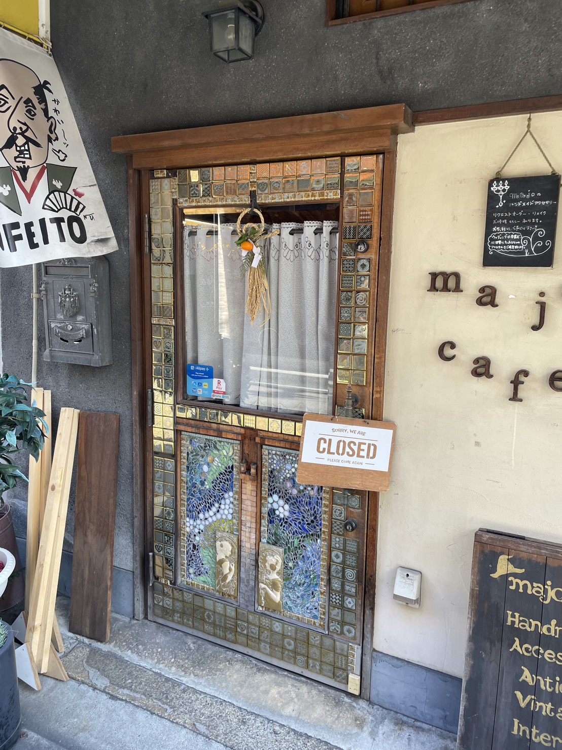 とてもすてきなカフェ。扉も様々なタイルがはられており、こだわりが感じられる。織田信長?も思わず左上で「かわい~ッ」と叫んでしまう。