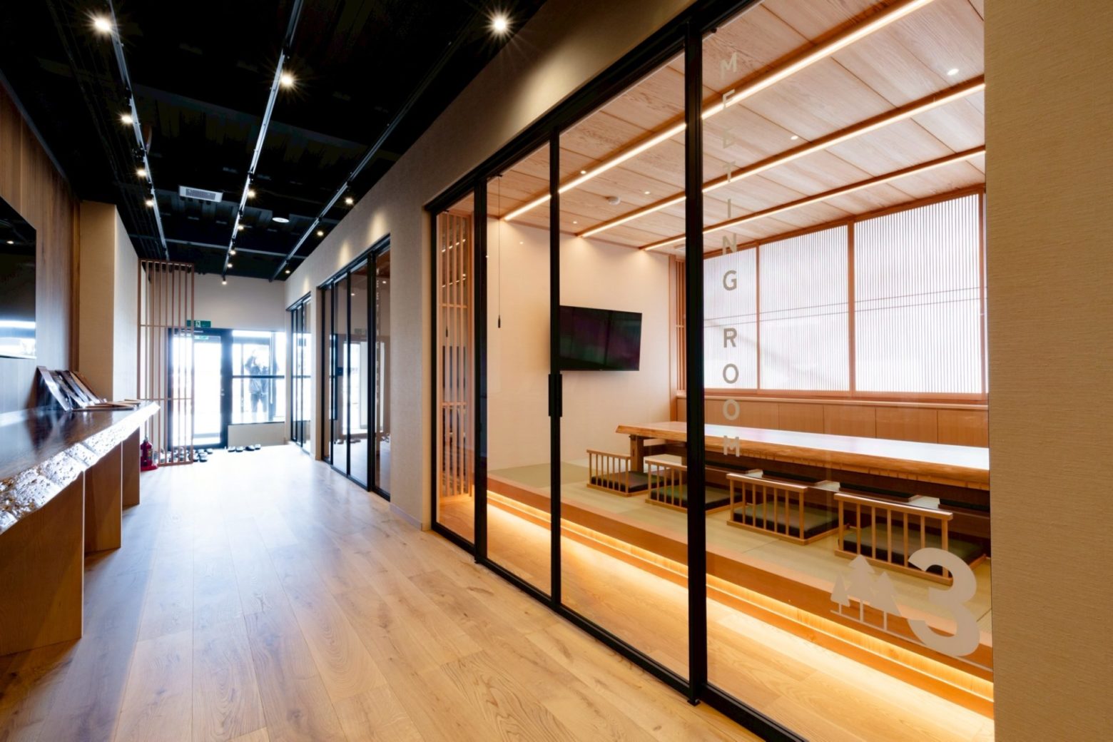 一枚板の存在感がより際立つよう、天井や壁は黒で統一し、打合せにも使用できる和室を新設しました。空間の要所にはこだわりの木材を組み込み、床にはオリジナルのフローリング材を採用しているのもポイントです。