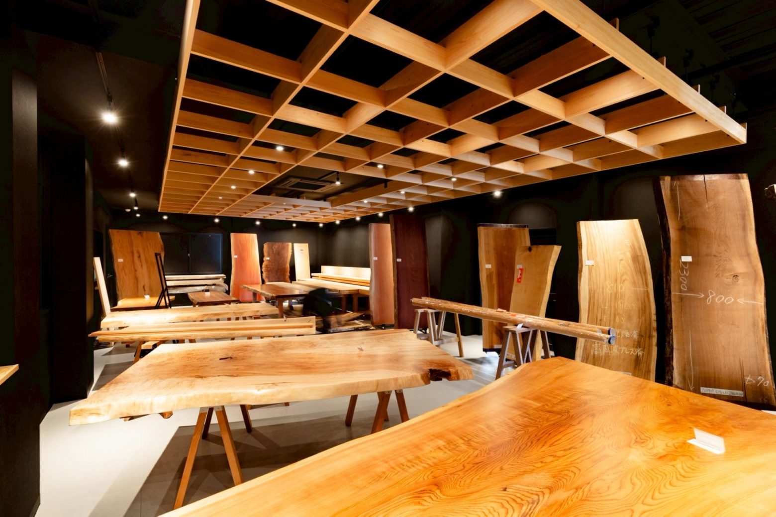 同じものは二つとない無垢一枚板のショールームとして、「見て感じる。触れて感じる。空間で感じる。」をコンセプトに設定。