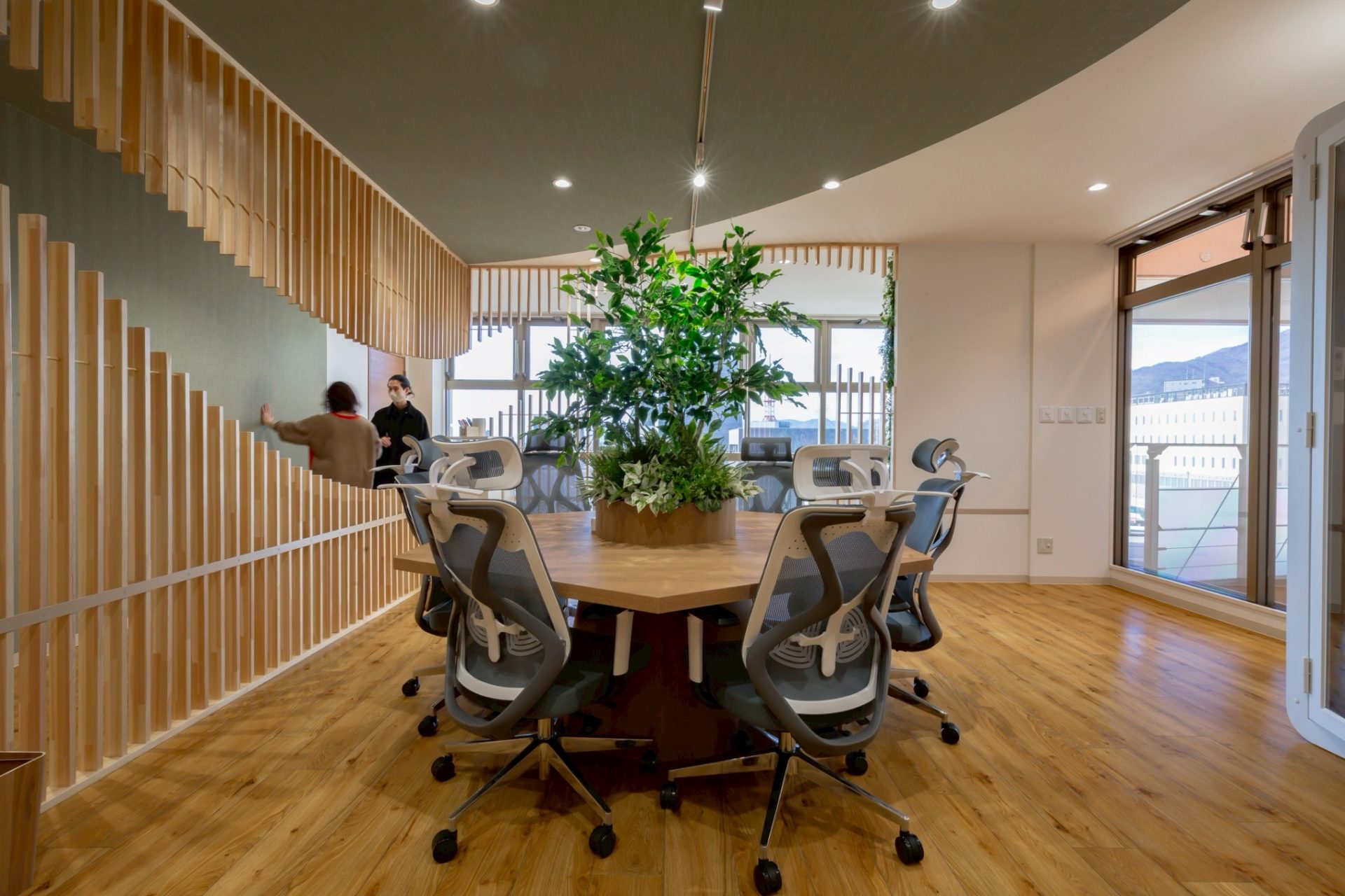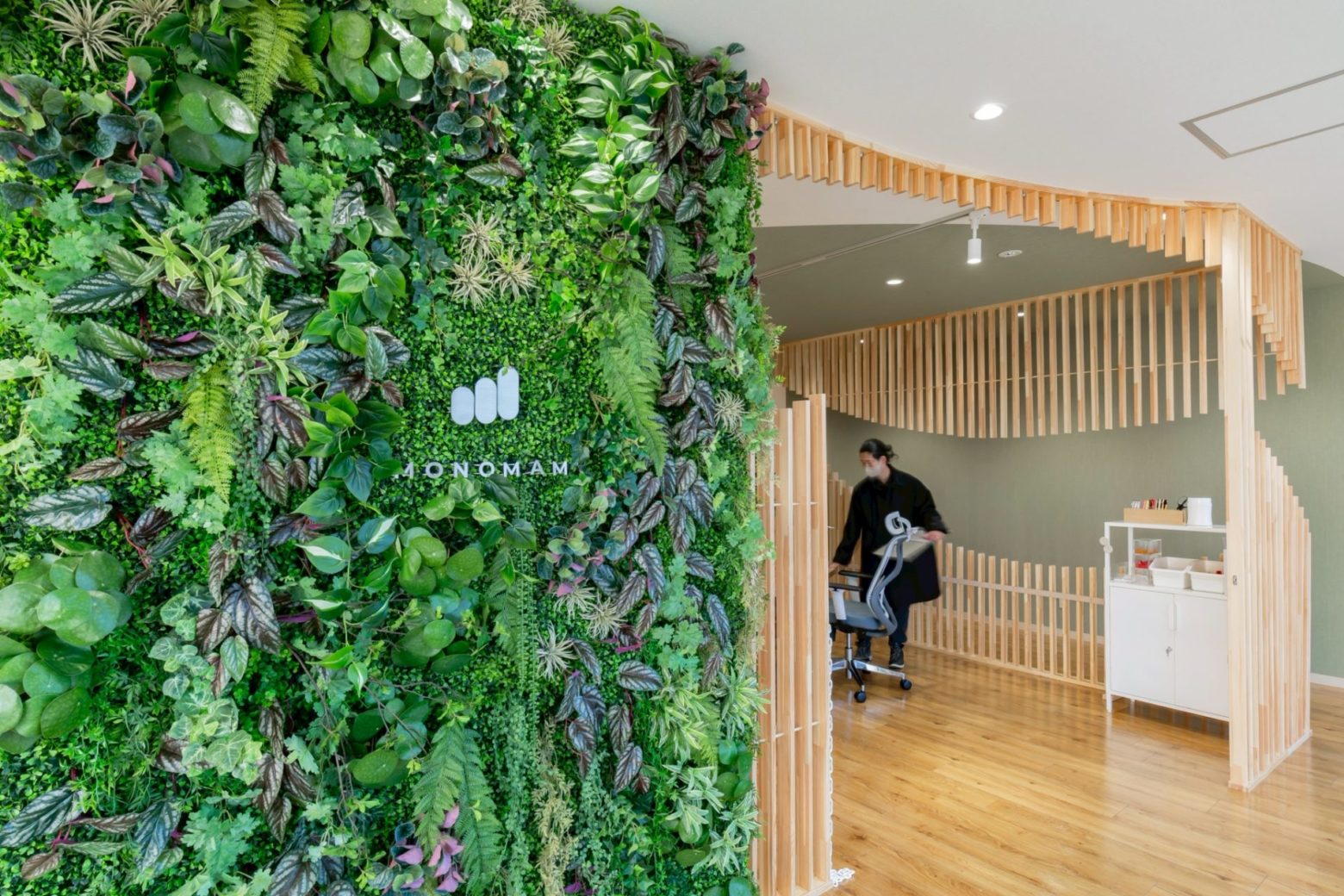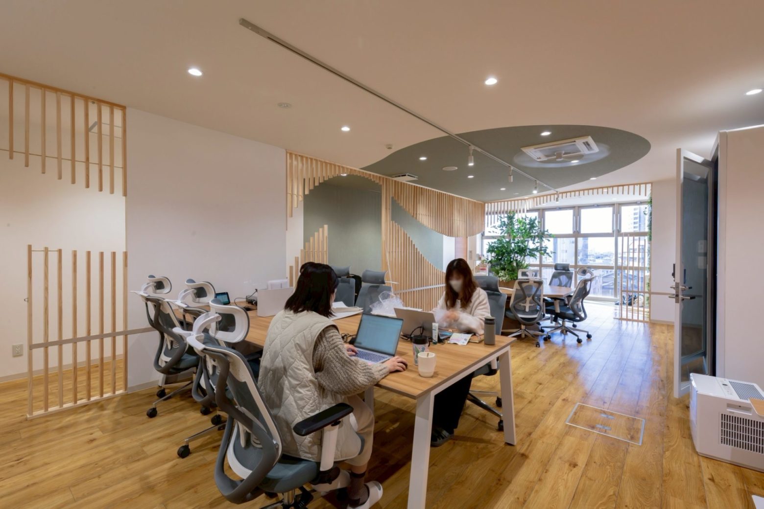 その一環として、木材の縦ルーバーを間仕切り壁に用い、直線的に並べるのではなく一部に抜けを設けて流線形を描くことで、空間をやわらかく区切っています。