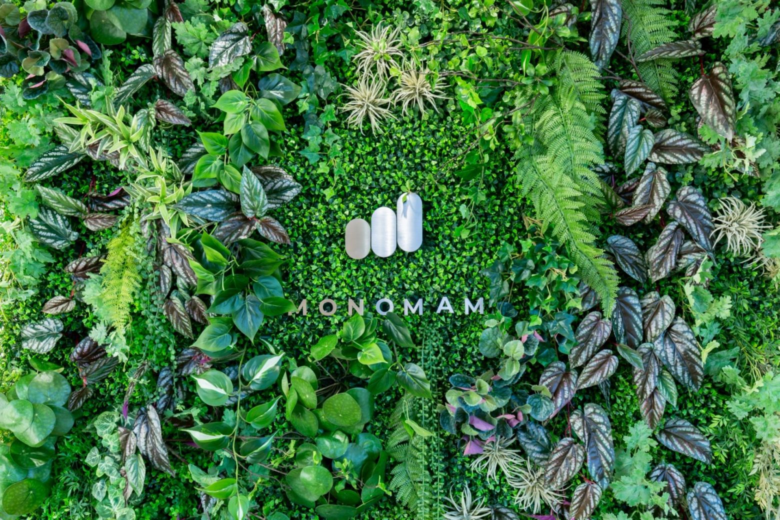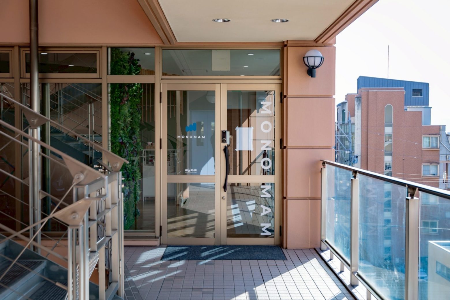 エントランスには、フェイクグリーンの中にステンレス製のロゴサインを配置。