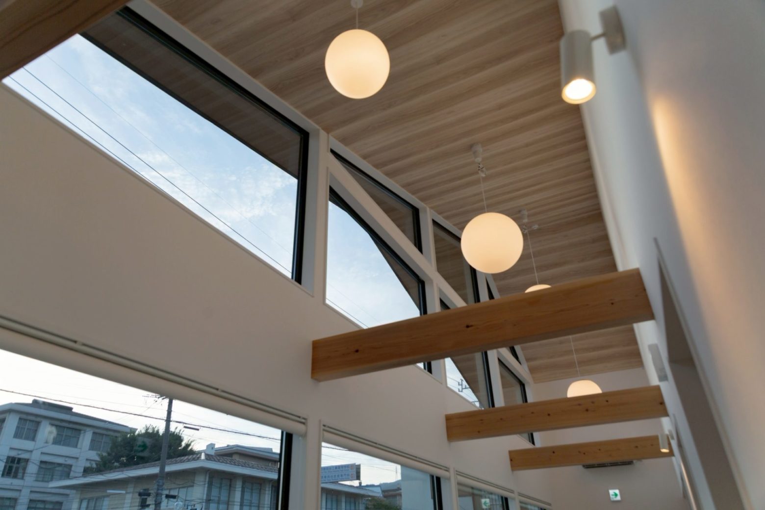 外観は大きく張り出した切妻屋根が特徴的で、建物全体に迫力を与えるデザイン。
